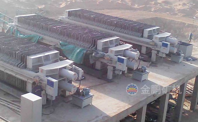 浸出槽最后的尾礦經緩沖槽由泵輸送到全自動廂式壓濾機,壓濾后的水流入循環水池以備循環利用,濾餅經帶運輸機運到尾礦堆場,卡車將尾礦運到尾礦庫。