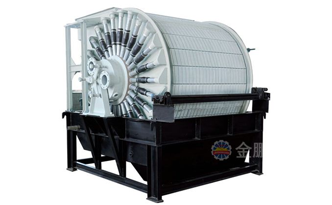 磁濾機的給料槽在上部,由于上部給料,濾餅又在磁場中形成,所以濾餅中精礦按粒度分層現(xiàn)象明顯,并呈放射狀分布。濾餅不但厚而且透氣性好,易于脫水。