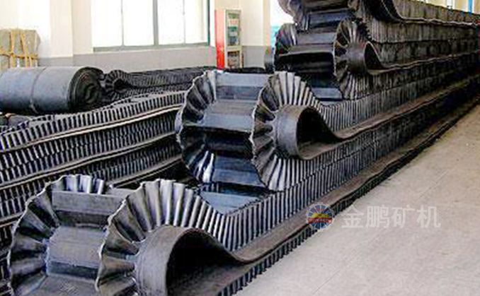 波狀擋邊輸送帶中以大傾角波狀擋邊輸送帶最有名,大傾角波狀擋邊輸送帶又叫裙邊隔板輸送帶,是由基帶、擋邊、橫隔板3部分組成。擋邊起防止物料測滑撒落的作用。為便于繞過滾筒,檔邊設(shè)計成波紋狀;橫隔板的作用是承托物料,為了實現(xiàn)大傾角輸送,采用T型TC型。檔邊和橫隔板是用二次硫化的方法與基帶連接的,具有很高的連接強度。